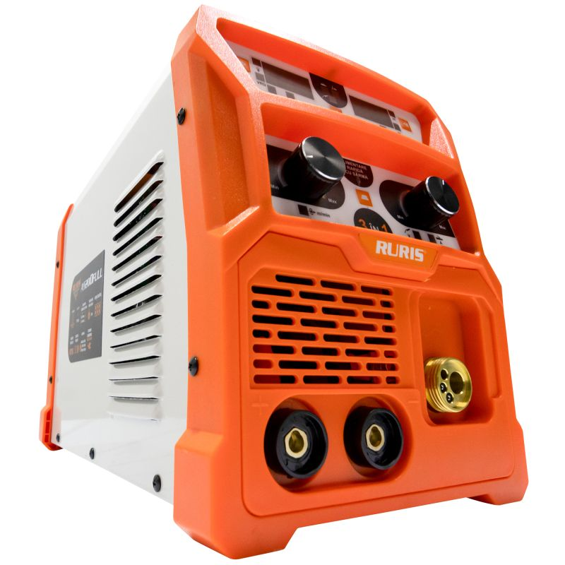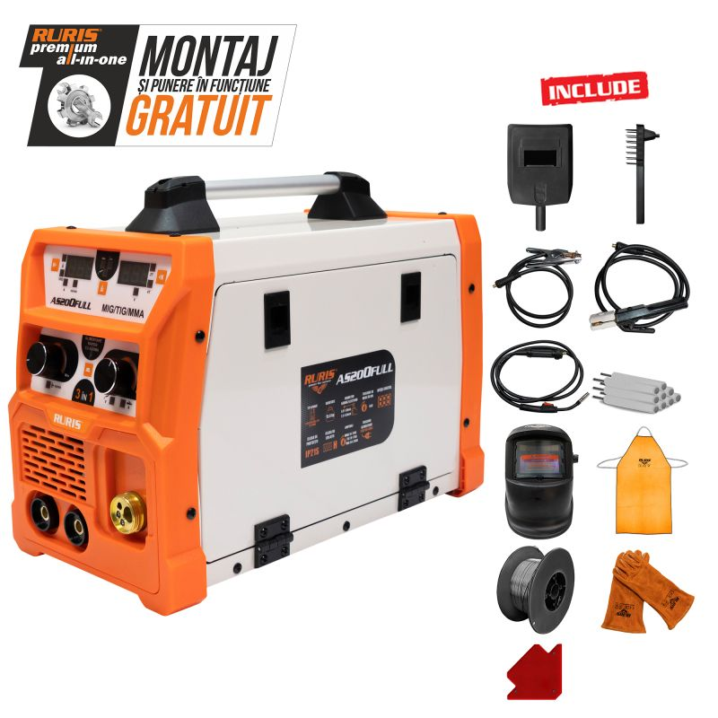 Aparatul de sudură RURIS AS200FULL de tip invertor, cu un amperaj de 200Ah, este un echipament de sudură compact și portabil, care poate efectua mai multe tipuri de sudură: MIG/MAG, LIFT TIG, MMA.
