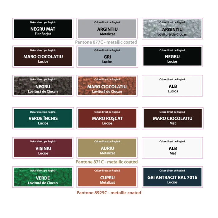 Oskar - direct pe rugina este o vopsea ce are la baza rasini alchidice, pigmenti, solventi organici, sicativi, aditivi si este utilizata pentru protejarea suprafetelor interioare si exterioare din metal, atacate de rugina, avand un triplu rol: inhibator de rugina, grund si vopsea. Aceasta vopsea este recomandata pentru acoperirea suprafetelor noi, precum si pentru repararea suprafetelor care au mai fost vopsite.